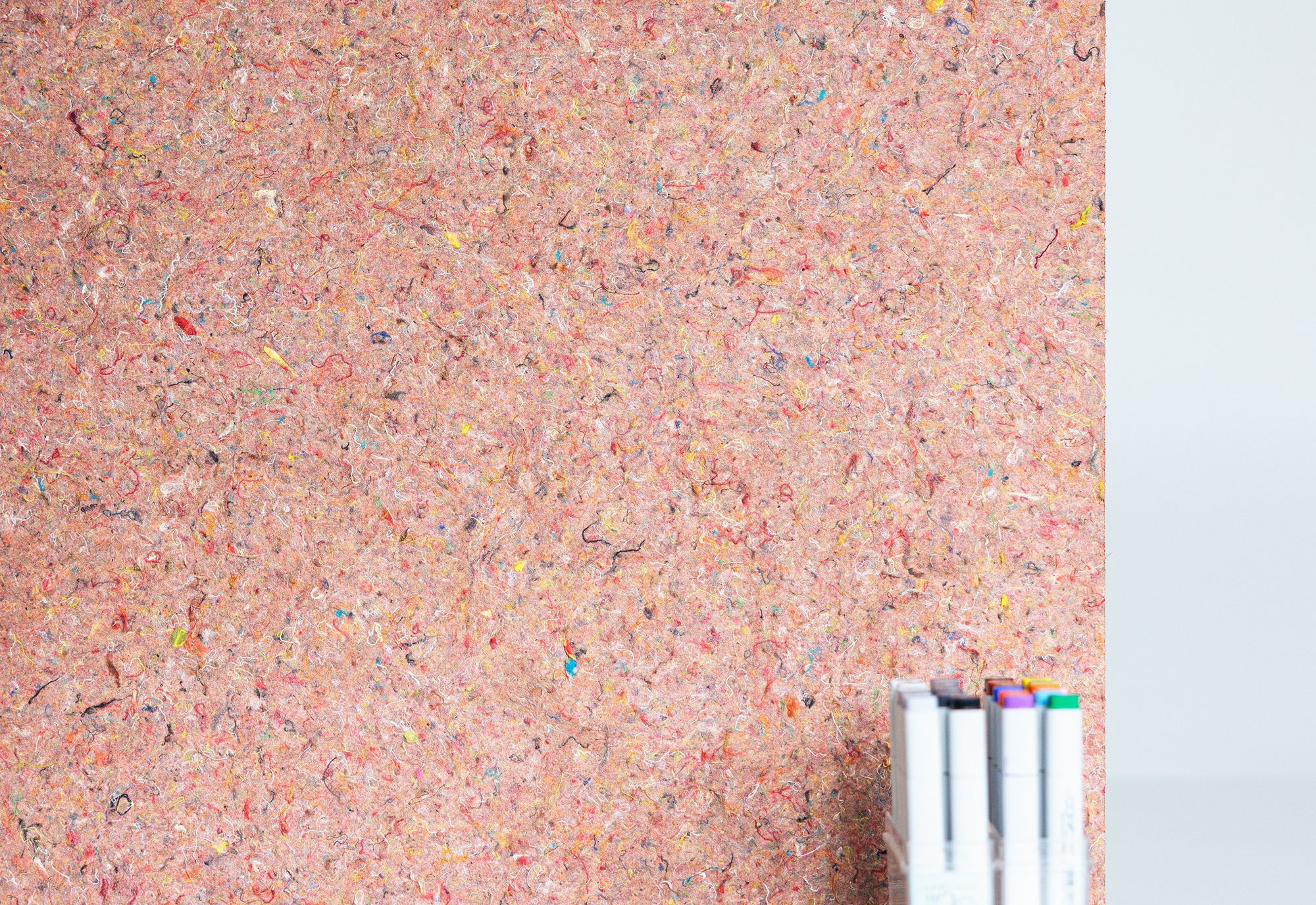 Der über mehrere Jahre entwickelte Recyclingprozess ermöglicht es, hochwertige Preconsumertextilien und Produktionsabfälle direkt im eigenen Werk zu sammeln und zu sortieren. Diese Materialien werden anschliessend in einem mehrstufigen Verfahren aufbereitet. Dadurch können unsere langlebigen und hochwertigen Textilien zu stabilen Platten gepresst und als wertvolle Ressource in den textilen Kreislauf zurückgeführt werden.