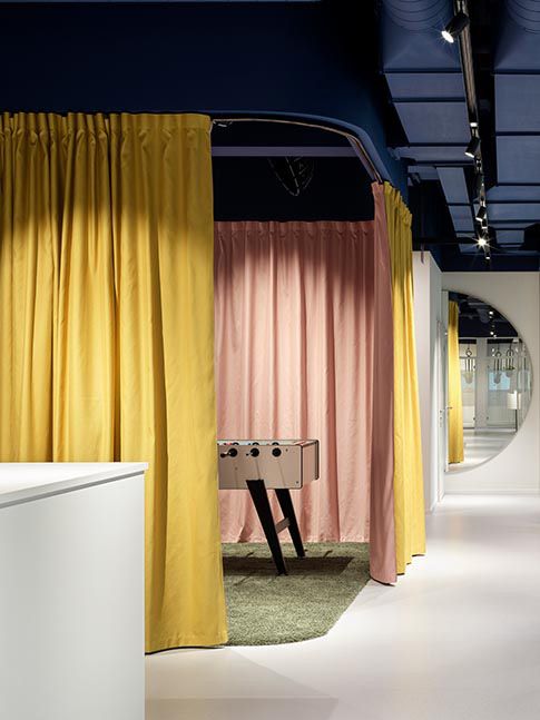 研修やイベント用の多目的ホールは、様々な用途に柔軟に対応できるよう、開閉できるカーテンによって空間を間仕切り、同時に音響を改善した上で上質な雰囲気を作り出しています。