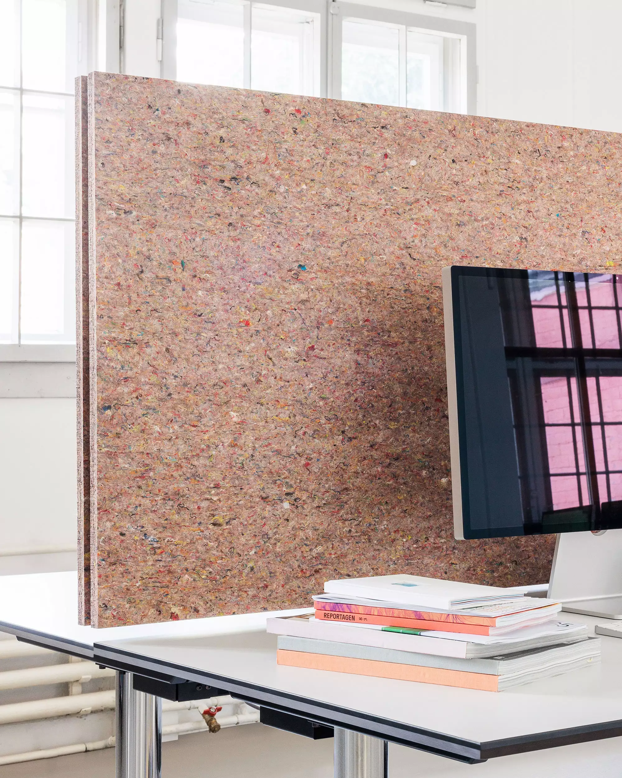 • Mit der Absorberplatte ABSORBER RECYCLED bietet Création Baumann eine nachhaltigeLösung zur gezielten Steuerung von Geräuschkulissen – ideal geeignet für moderne Räumeund Umgebungen, von Büro und Home-Offices bis hin zu offenen Wohnräumen und weiterengrosszügigen Raumsituationen. Die Grundlage für diese Akustiklösung bildet der über mehrere Jahre entwickelte Recyclingprozess, der auf die Wiederverwertung eigener Textilressourcen setzt. Hochwertige Preconsumer-Textilien und Produktionsabfälle aus dem eigenen Werk werden systematisch gesammelt, sortiert und in einem mehrstufigen Verfahren aufbereitet. So wird eine grosse Menge wertvoller Rohstoffe sinnvoll wiederverwendet – ein wirkungsvoller Beitrag zur Ressourcenschonung. Die Textilien werden zu stabilen Platten verarbeitet, passgenau zuge-schnitten und zu unseren Akustikpaneel-Systemen weiterverarbeitet:– ACOUSTIC ROOM DIVIDER: Beidseitig wirksame Akustiktrennwand, freistehend auf Oberflächen oder als hängendes Element von der Decke.– ACOUSTIC WALL COVER: Einzelne oder mehrere flächenbündige Akustikpaneelen für Wandbereiche.