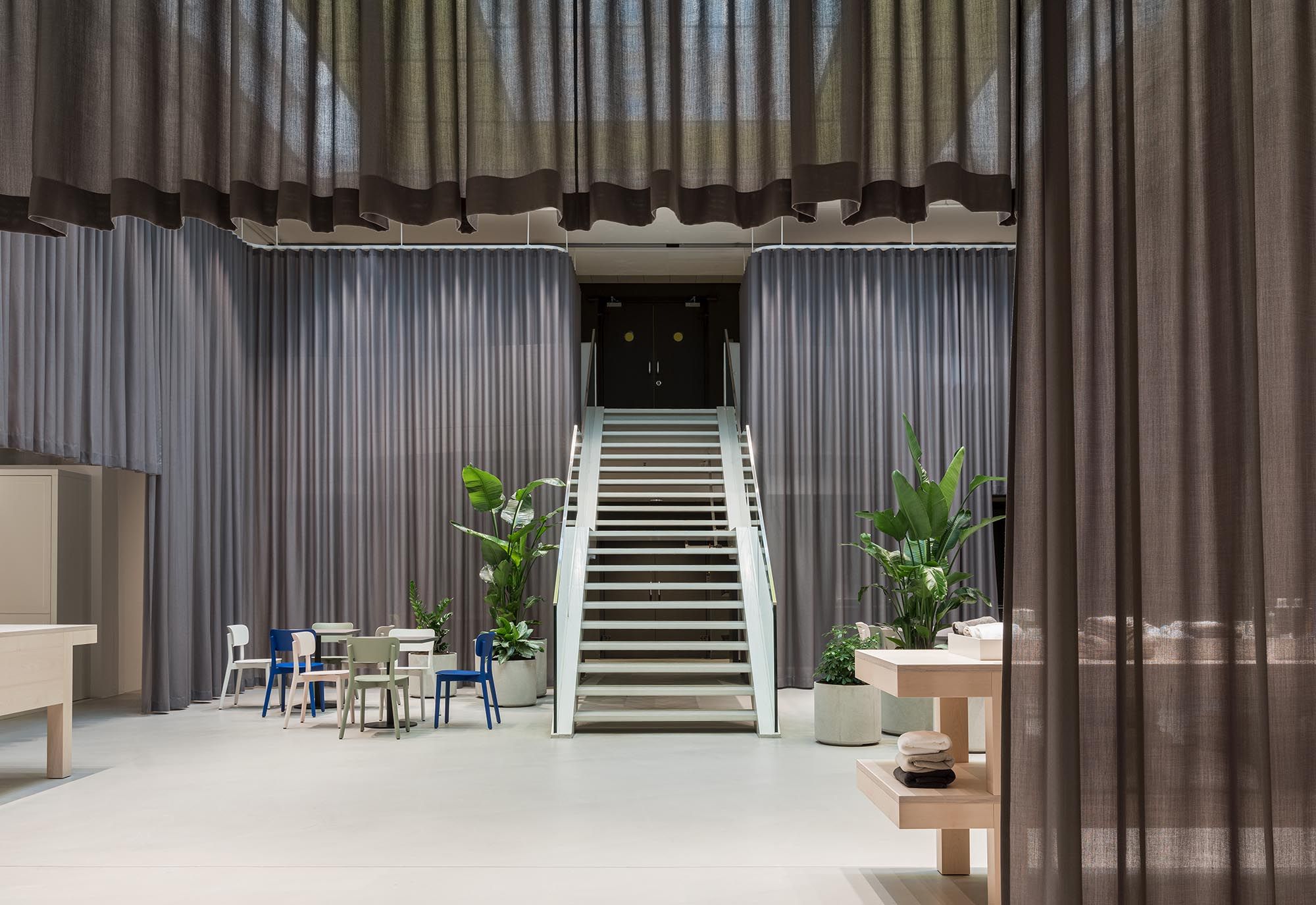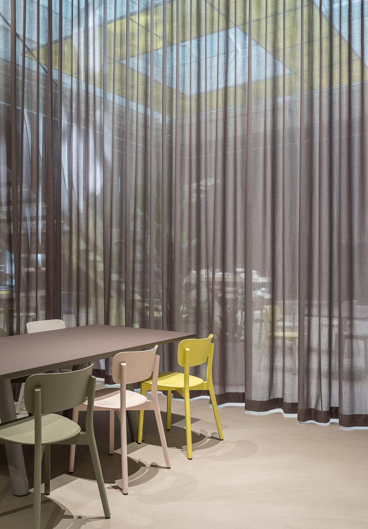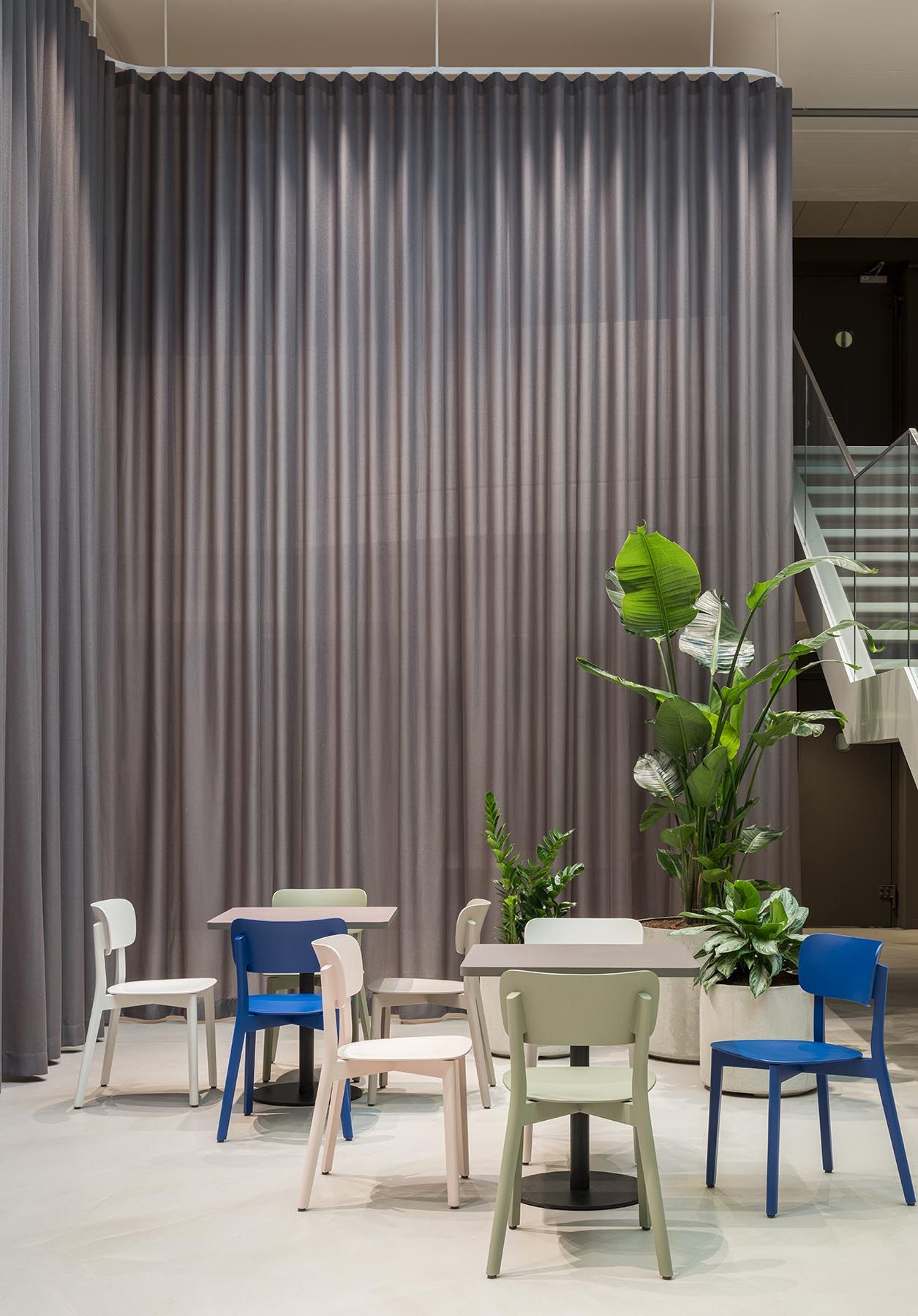 Mit minimaler baulicher Eingriffstiefe schafft der raumhohe, halbtransparente Vorhang SOLIO eine klare Struktur und verleiht dem Empfangsbereich eine neue, ruhige Ordnung. Die textile Intervention wirkt wie eine sanfte Membran. Durch das präzise Öffnen und Schliessen des Vorhangs entstehen gezielt geführte Wege und definierte Blickbezüge. Störende Elemente treten in den Hintergrund, während zentrale Bereiche subtil hervorgehoben werden. Die Halbtransparenz von SOLIO ist dabei entscheidend – sie bietet genau die richtige Balance zwischen Durchlässigkeit und Abschirmung und ermöglicht eine klare, aber atmosphärisch weiche Zonenbildung.