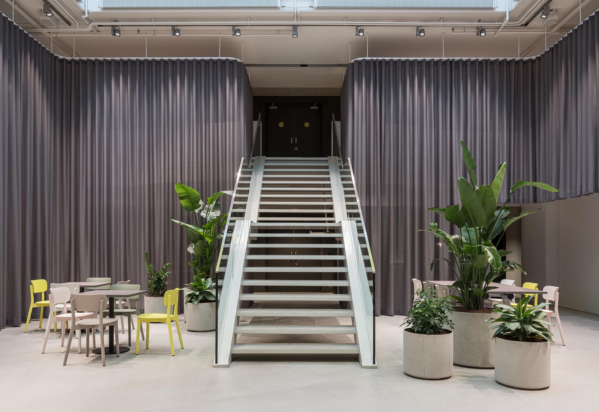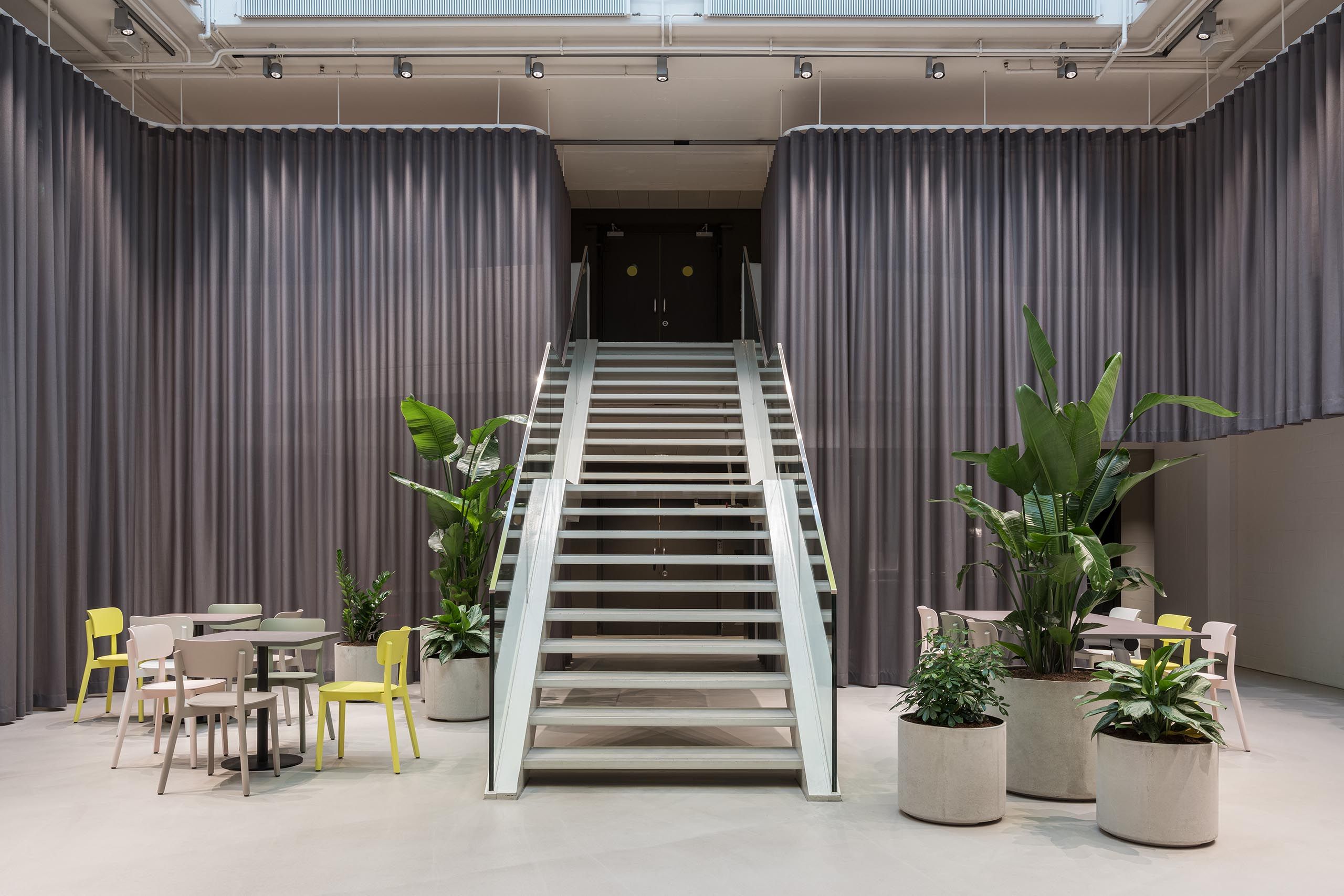 Die breite Palette an fein abgestuften Grautönen ermöglicht eine optimale farbliche Integration in den Bestand. So fügt sich der Vorhangstoff harmonisch in die postmoderne Architektur ein und schafft ein einladendes, professionelles Erscheinungsbild. Dadurch entsteht ein Empfangsbereich, der Orientierung bietet, die Aufenthaltsqualität steigert und das gewünschte zeitgemässe «Welcoming Ritual» überzeugend unterstützt.
