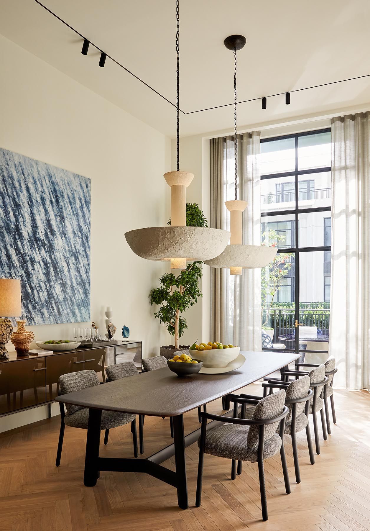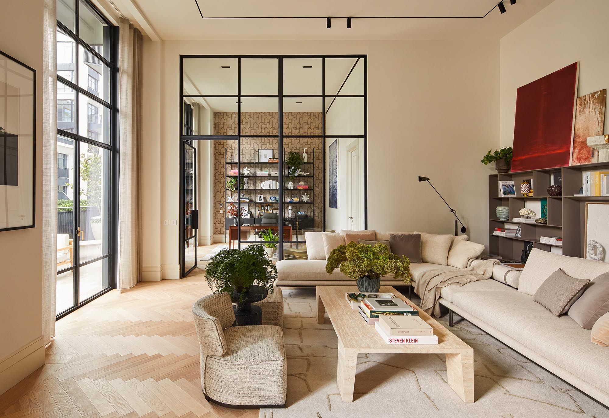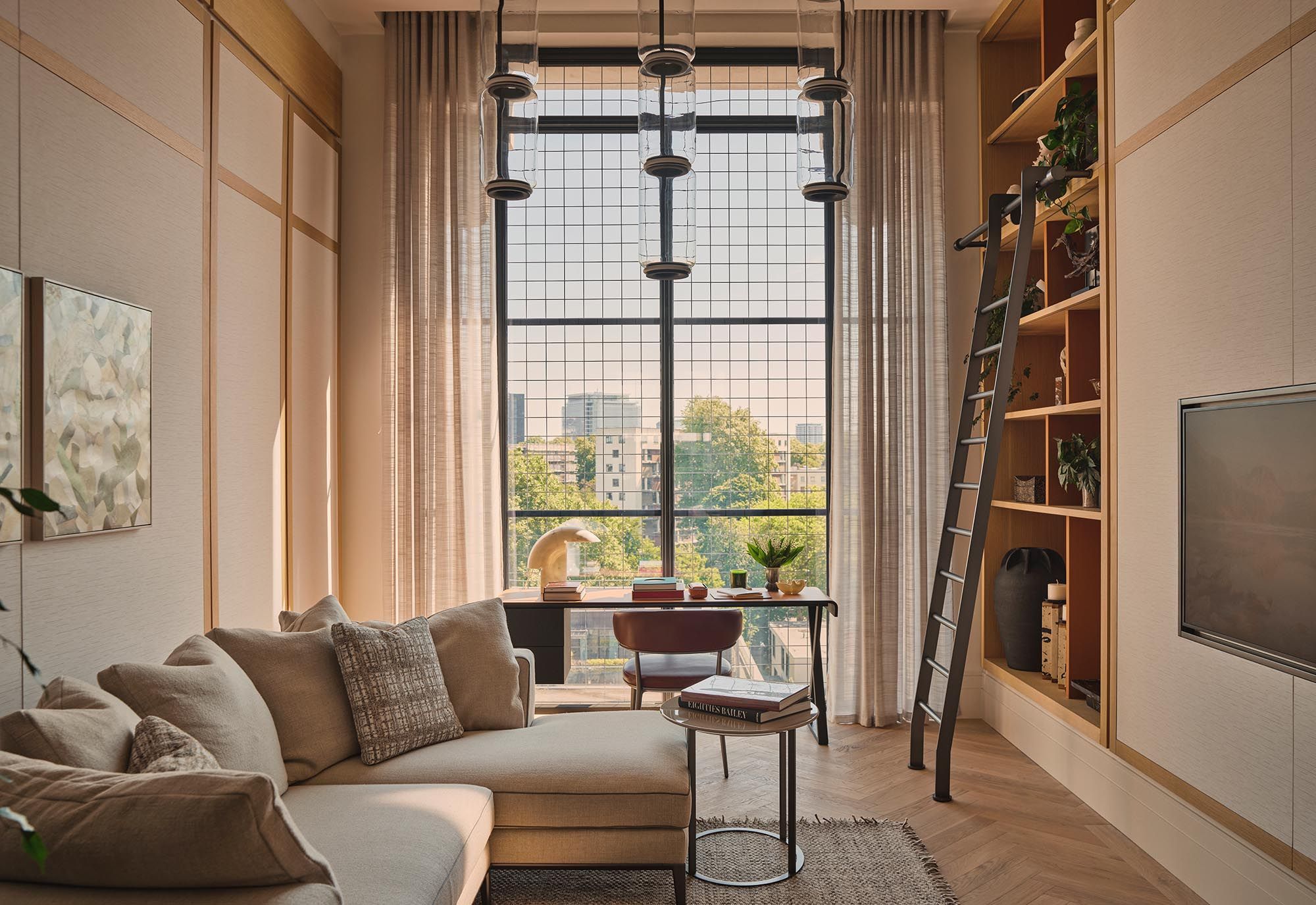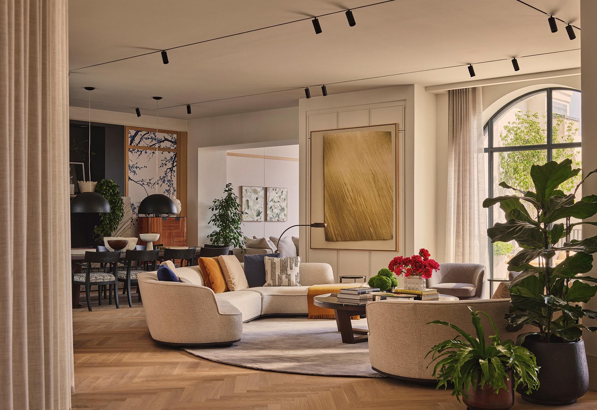 Die geschwungenen Formen des Wohnbereichs werden durch NARCIS-Vorhänge betont, während die leichtgewichtigen, leinenähnlichen NOLIN-Vorhänge auf der gegenüberliegenden Seite die ursprünglichen Fensterformen elegant hervorheben. Die textilen Lösungen schaffen ein harmonisches Spiel aus Licht, Raum und Textur und verleihen der Wohnung einen subtilen, luxuriösen Charakter, der sowohl Funktionalität als auch ästhetischen Anspruch vereint.
